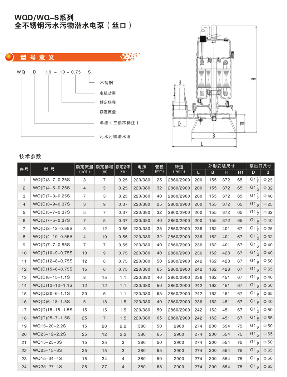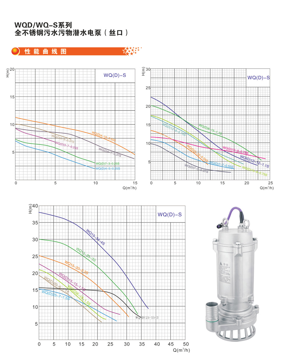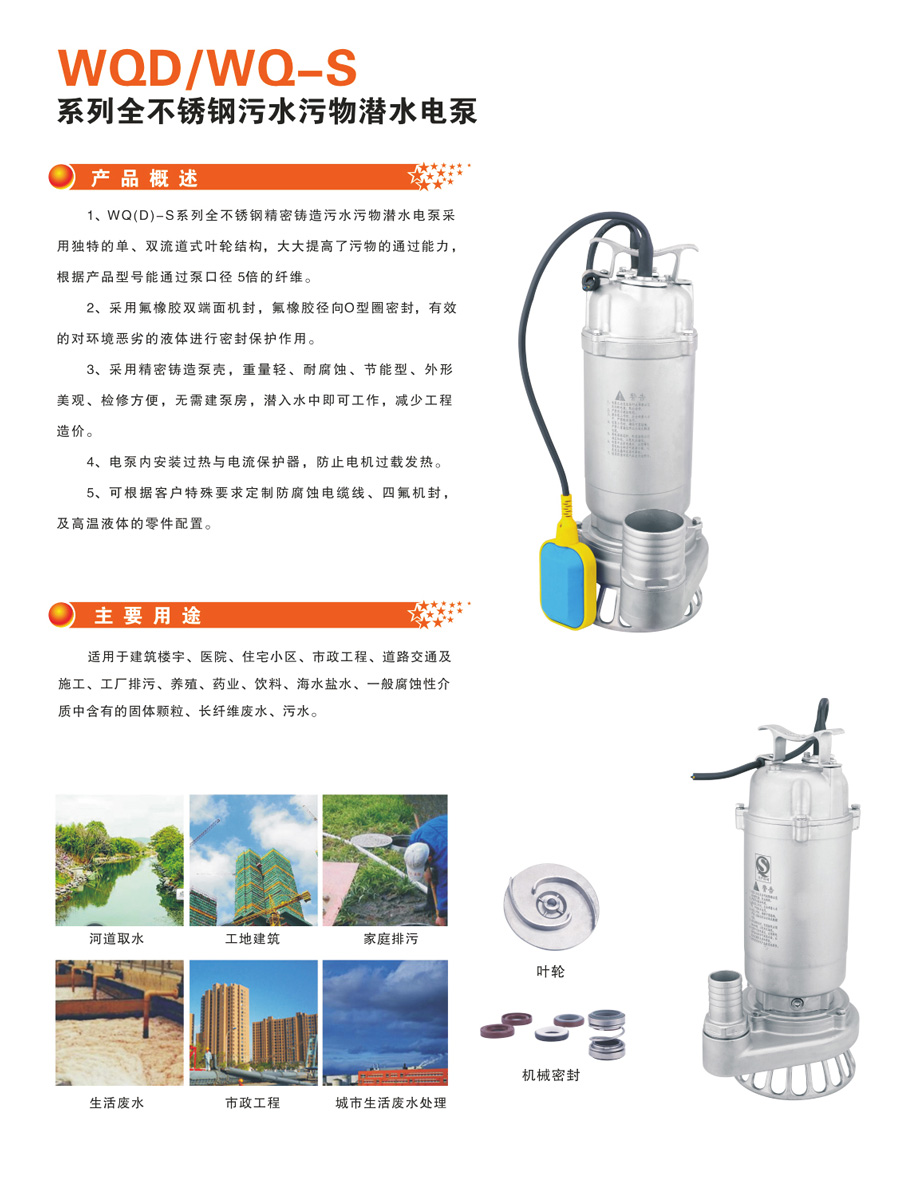 WQD/WQ-S 系列全不锈钢污水污物潜水电泵